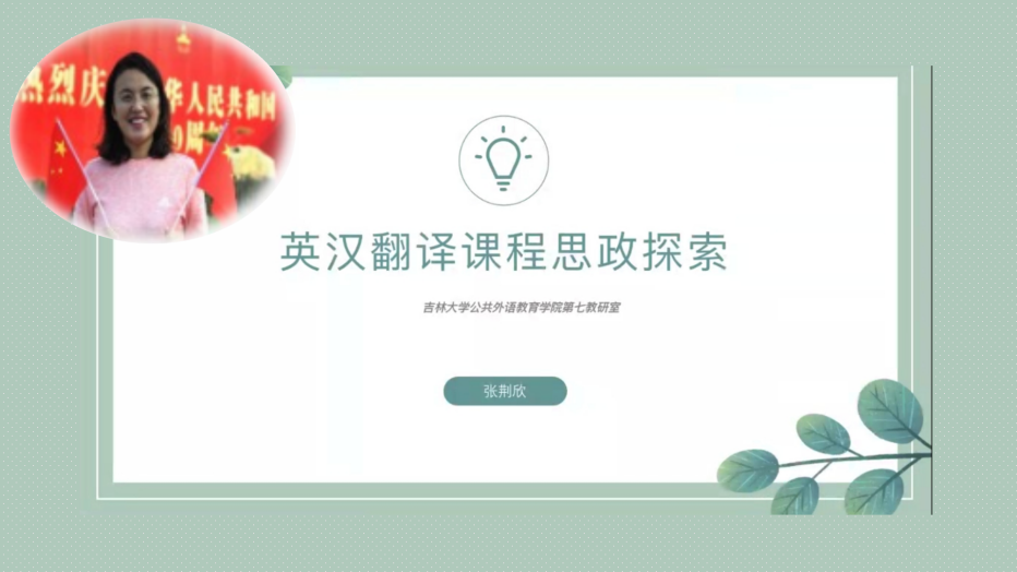 首先,大学英语第七教研室张荆欣老师以“英汉翻译课程思政探索”为主题,从多个角度回顾了课程思政的产生背景,并强调了课程思政建设的重要性。其次,张老师根据《大学英语教学指南(2020版)》及教育部印发的《高等学校课程思政建设指导纲要》等指导文件,从英汉翻译的课程特点及学生基本学情入手,分享了英汉翻译课程思政的教学目标、思政元素的挖掘以及思政素材如何与课程知识点相结合的话题。“习近平新时代中国特色社会主义思想”、历史唯物主义、辩证唯物主义科学思维方法、党的“十九届五中全会”精神、“十四五”规划及2035年远景目标、外语学科中的人文教育、跨文化素养、批判性思维、中西文化对比以及翻译学科在中西文化交流中的独特作用等方面内容分都是外语课程思政“溶盐入水”过程中重要的“盐分”来源。此外,张荆欣老师还结合具体教学方法分享了英汉翻译课程思政教学设计方案,同时强调了具体实施外语课程思政过程中需要注意的问题及其产生原因。