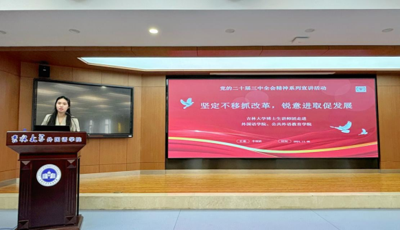 为深入学习宣传贯彻党的二十届三中全会精神,2024118日,吉林大学博士生讲师团走进公共外语教育学院,开展以坚定不移抓改革,锐意进取促发展为题的党的二十届三中全会精神系列宣讲活动。次活动由李颂婧讲师进行宣讲,公共外语教育学院辅导员林明帅,研究生一、三支部全体党员,入党积极分子及入党申请人等百余名研究生参加。
