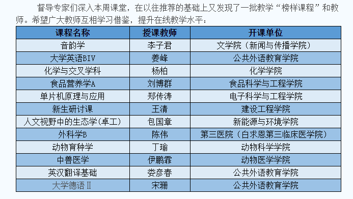 值得一提的是,在教学质量提升月中,学院有四门课程被校督导专家评为教学“榜样课程”,分别是:刘景珍老师讲授的《大学英语BIV》、姜峰老师讲授的《大学英语BIV》、娄彦春老师讲授的《英汉翻译基础》以及宋珊老师讲授的《大学德语II》。希望学院教师们互相学习借鉴,积极创新提升教学水平,打造精品外语课堂。