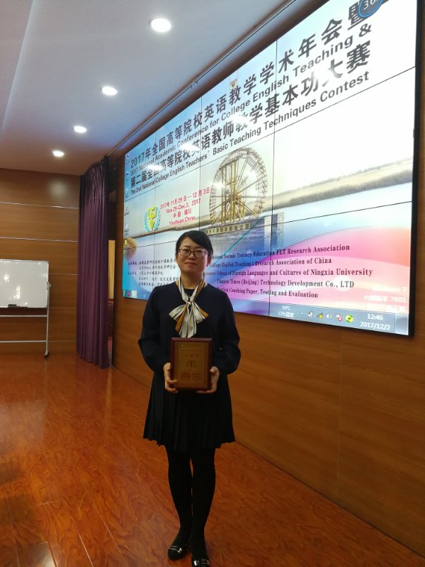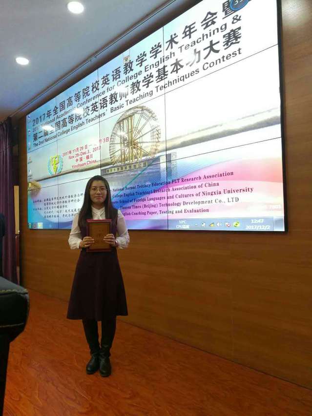 2017 年全国高等院校英语教学学术年会暨第二届全国高等院校英语教师教学基本功大赛”于20171129-123日在宁夏大学召开。大赛分“基本功大赛”和“精品课大赛”两种组别。根据教师现场授课教学基本功水平及教学效果、依据教师教学技能评价标准,由资深专家、参会教师代表和听课学生三方评分。