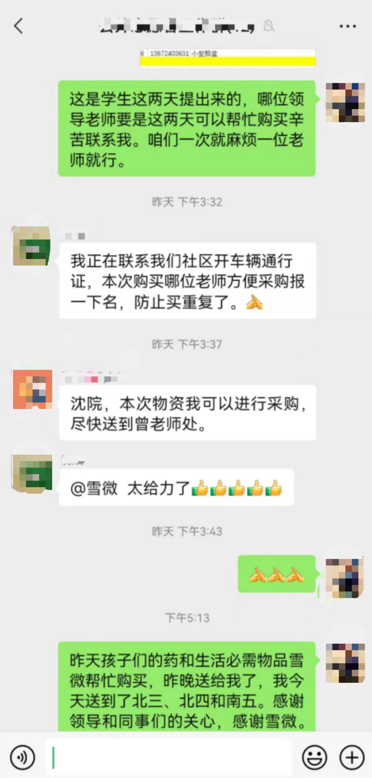 学院专业课教师授课之余,积极为同学们筹办各类学术讲座,激发大家的科研热情和信心。同时,导师们在线召开组会,学习之外更不忘叮嘱同学们注意防护,时刻做学生的坚实后盾。学院管理团队自发组成志愿者群,利用两天出门买菜的机会为校内同学购买急需用药和其他生活必需品。