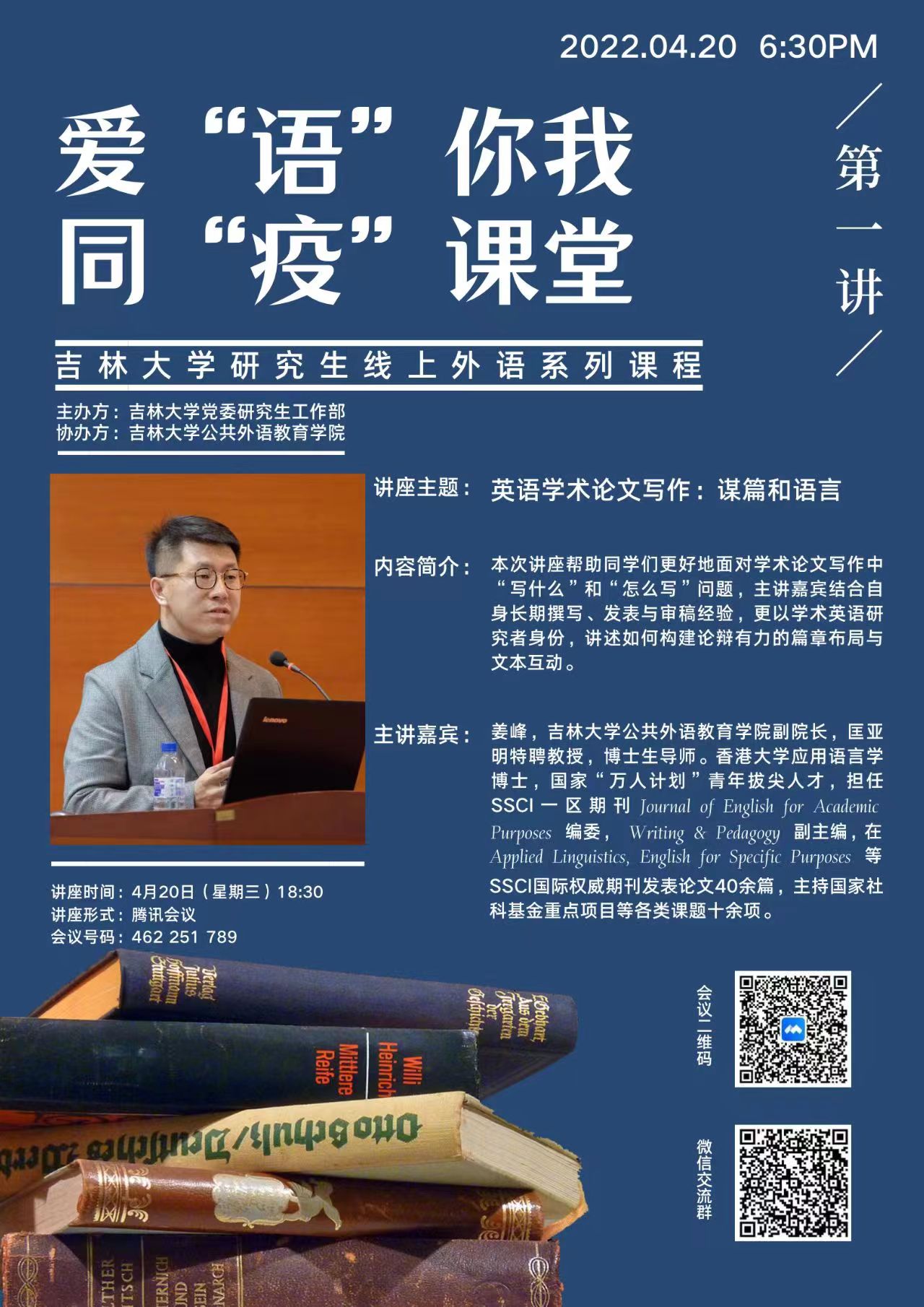 2022年4月20日晚6:30,由吉林大学党委研究生工作部主办,公共外语教育学院协办的爱“语”你我,同“疫”课堂——吉林大学研究生线上外语系列课程第一课开讲。第一课的主题为“学术英语论文写作:谋篇和语言”,由公共外语教育学院副院长、匡亚明特聘教授姜峰老师主讲,校内外研究生踊跃参与。