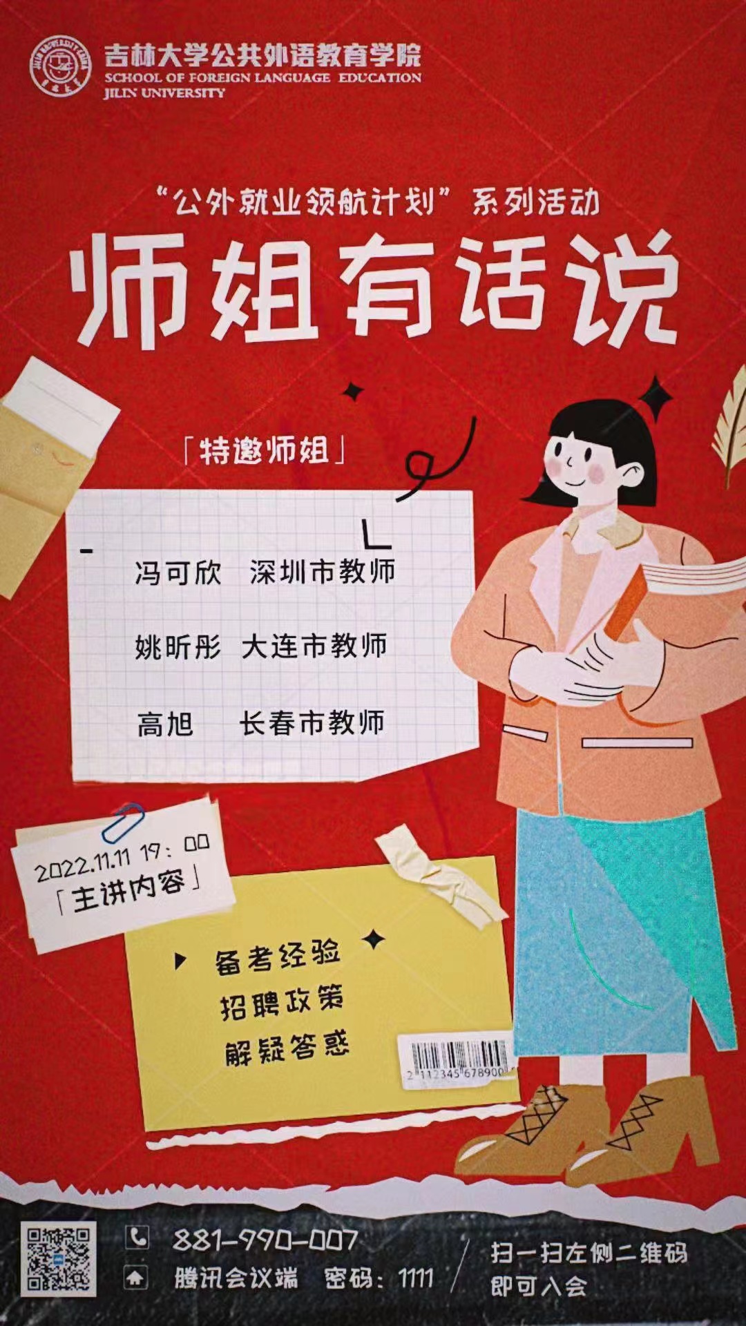 为更好帮助2023届毕业生明确求职规划、提升就业竞争力、实现高质量就业,2022年11月11日晚7点,公共外语教育学院线上举办“公外就业领航计划”系列活动——师姐有话说、教师编专场分享会。此次分享会由学院研究生辅导员曾媛主持,特邀师姐:深圳市教师冯可欣、大连市教师姚欣彤和长春市教师高旭,学院各年级百余名同学线上参会。
